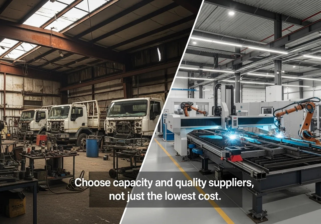 Kapasitas: tonase tahunan, peralatan CNC/laser, sambungan besar, kemampuan di puncak permintaan.